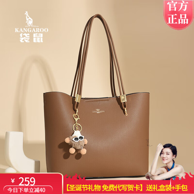 袋鼠卡拉情人节礼物送老婆真皮包包女包单肩包手提包2025新款托特包斜挎包 可可棕(手包+卡包+礼盒装)