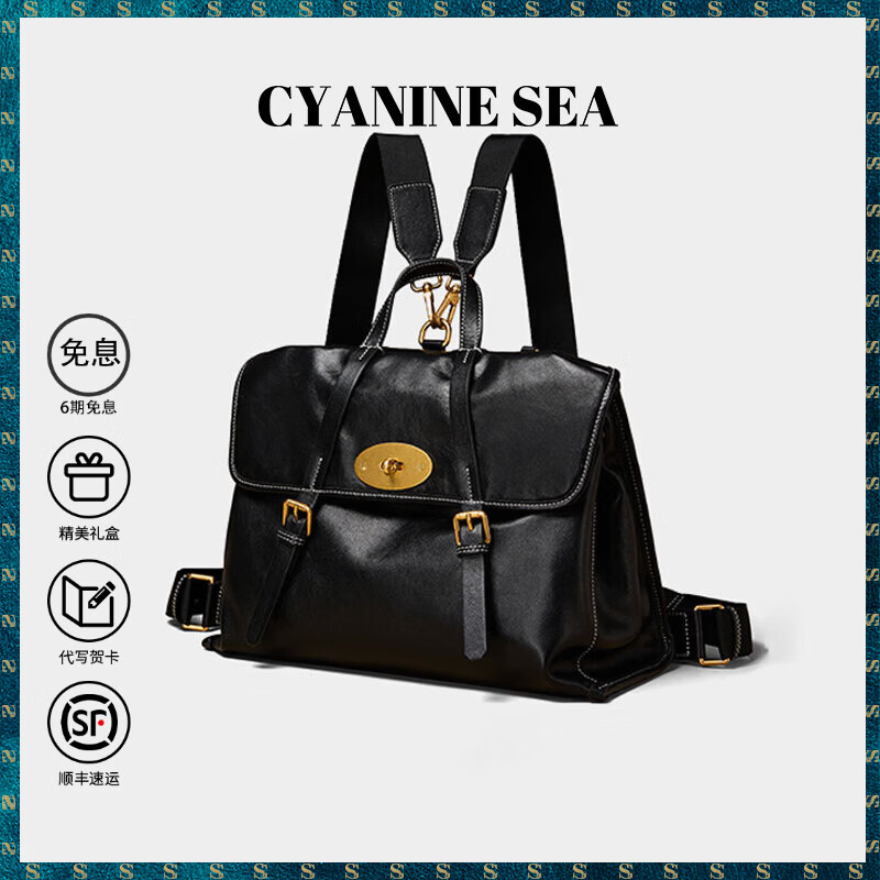 海青蓝 CYANINE SEA轻奢包包女款新款植鞣牛皮包女士包双肩包圣诞生日礼物送女友老婆 黑色