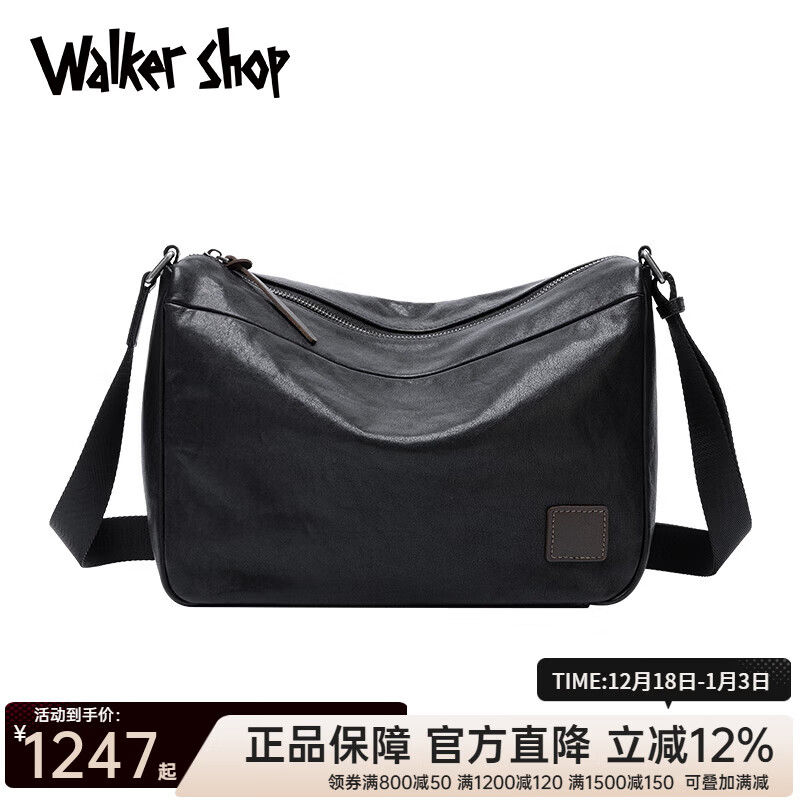 Walker Shop男士单肩包2025新款斜挎包男士真皮包包大容量软牛皮休闲背包通勤 黑色