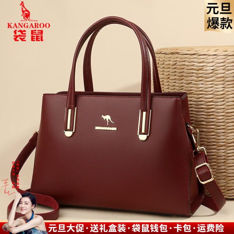 袋鼠跨年中年妈妈手提包真皮包包女包2025新款时尚牛皮斜挎包红色婚包 酒红色(礼盒+手包卡包)