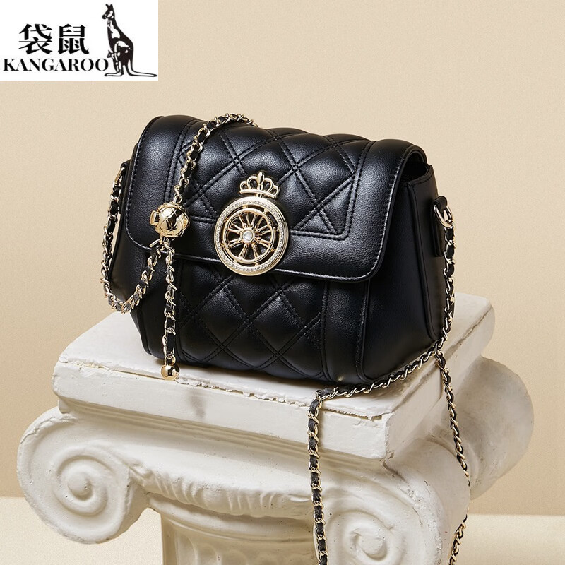 袋鼠奢侈.品牌真皮包包女包高级感菱格手提包包女百搭单肩斜挎小方包 黑色 礼盒装(送礼佳品)