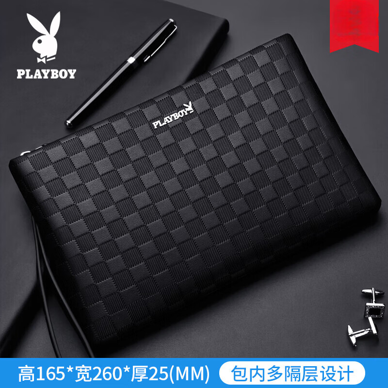 花花公子男士手包大容量手提包信封包手拿包商务皮包新款休闲时尚 格子黑-专柜包装
