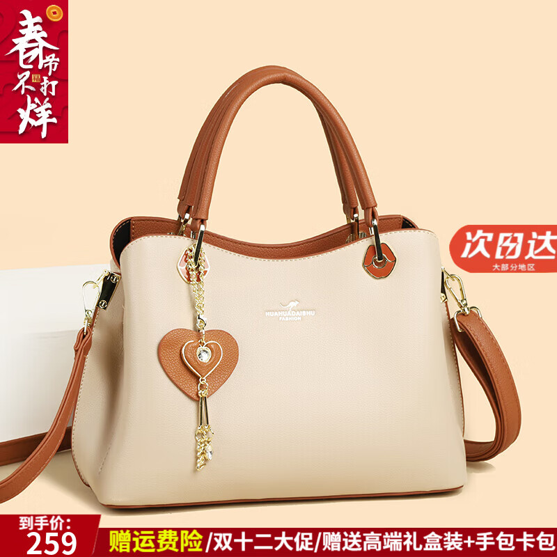 袋鼠卡拉2026情人节礼物中年女士手提包妈妈包软皮包包斜跨包正品品牌女包 米白色(手包+卡包+礼盒装)