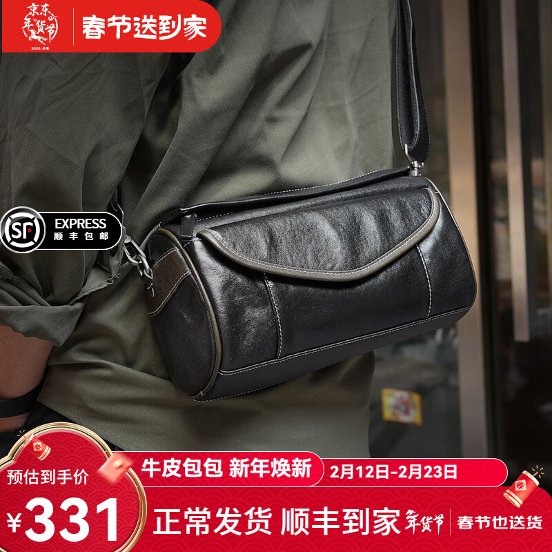 鹿师傅手工男士单肩真皮头层牛皮斜挎包新款通勤休闲复古男包邮差包皮包 植鞣黑 头层牛皮