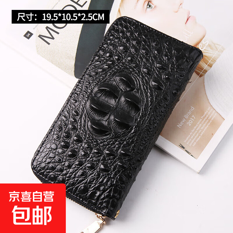 正品鳄鱼皮钱包女真皮长款手拿包新款时尚皮包多卡位拉链手包钱夹 长款鳄鱼钱包-黑色/