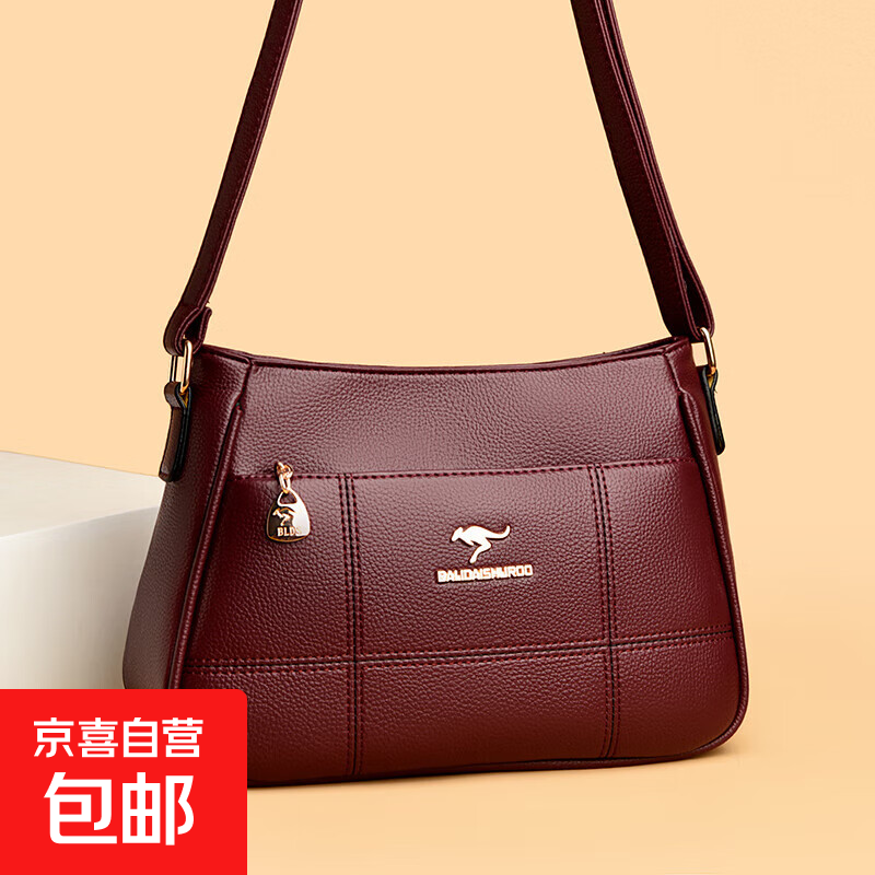 袋鼠卡拉新年送品牌包包女包轻奢牛皮包2025新款手提包送妈妈婆婆斜挎婚包 酒红色(礼盒装+手包卡包吊坠)