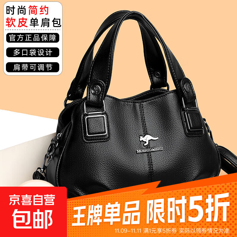 袋鼠真皮包包女包多层2025七夕中年妈妈简约百搭软皮单肩斜挎小包 黑色