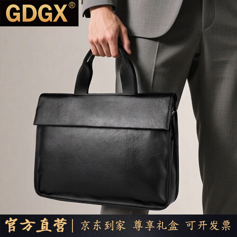GDGX真皮男士手提包商务公文包男款单肩斜挎包简约牛皮包横款电脑包 黑色【头层牛皮】 40*9.5*30cm