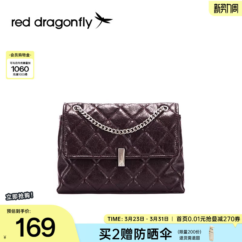 红蜻蜓复古斜挎包链条包棕色油蜡皮包包女式小香风菱格单肩小方包