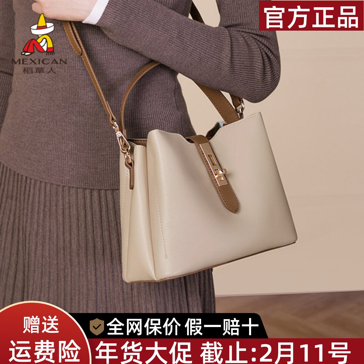 稻草人手提包女2025新款真皮包包时尚撞色斜挎包挂饰牛皮单肩女包