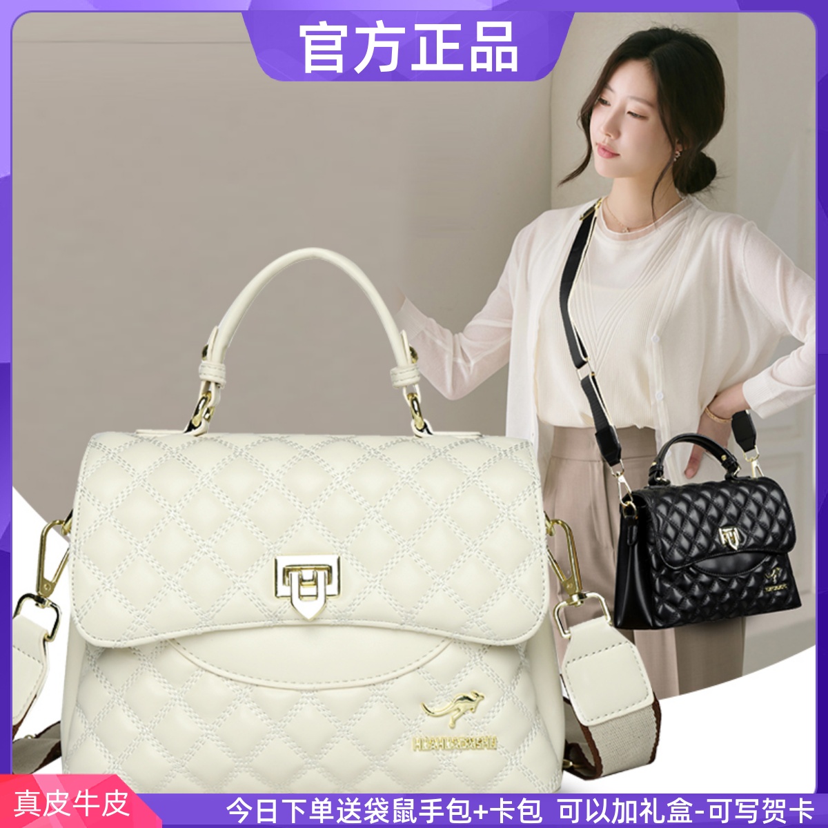 袋鼠正品真皮女包斜挎包2025新款时尚手提单肩包菱格百搭妈妈皮包