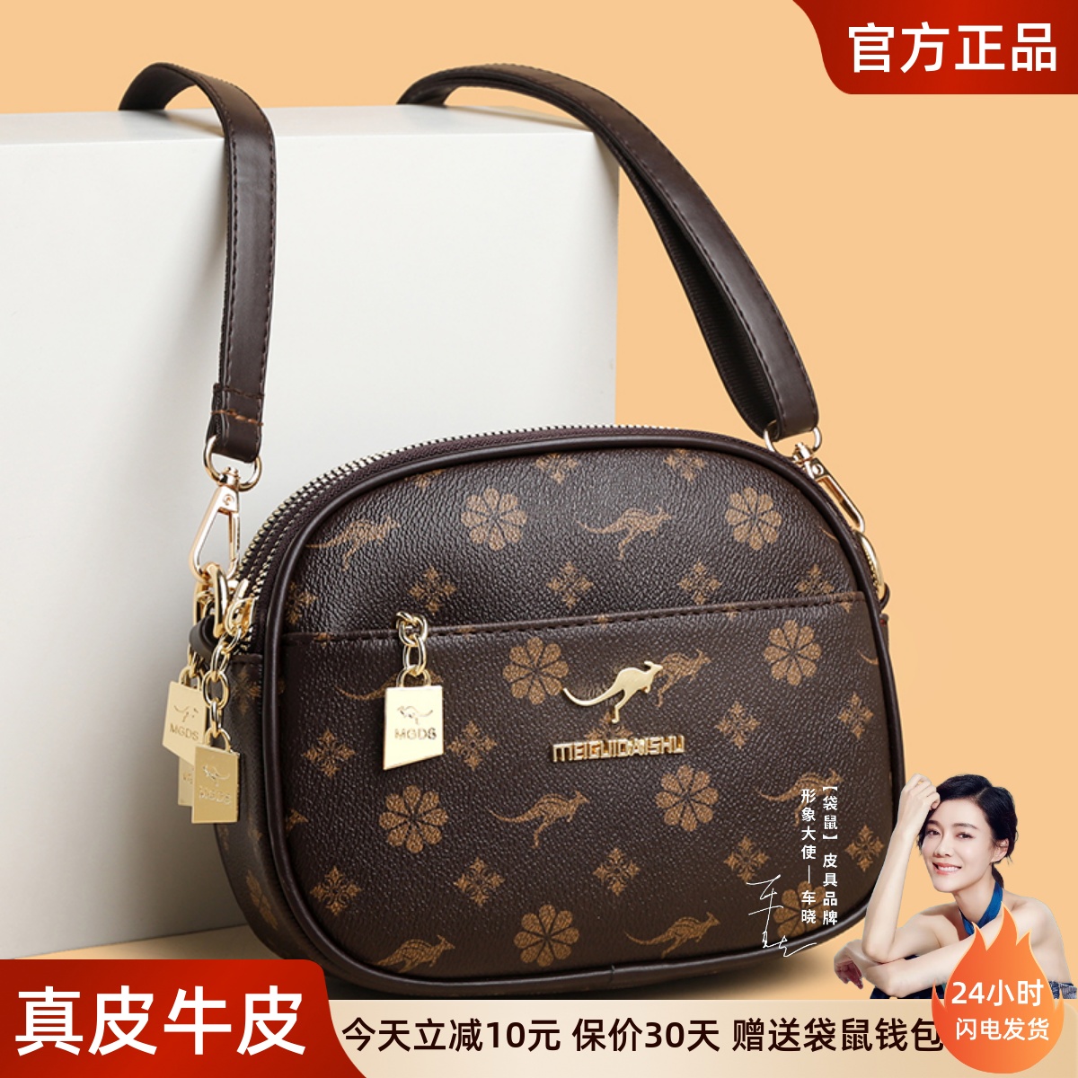 品牌袋鼠时尚中年手提包女士牛皮包2025新款大气妈妈包真皮斜挎包