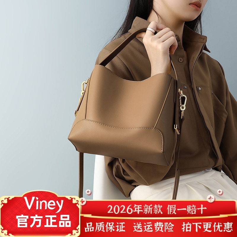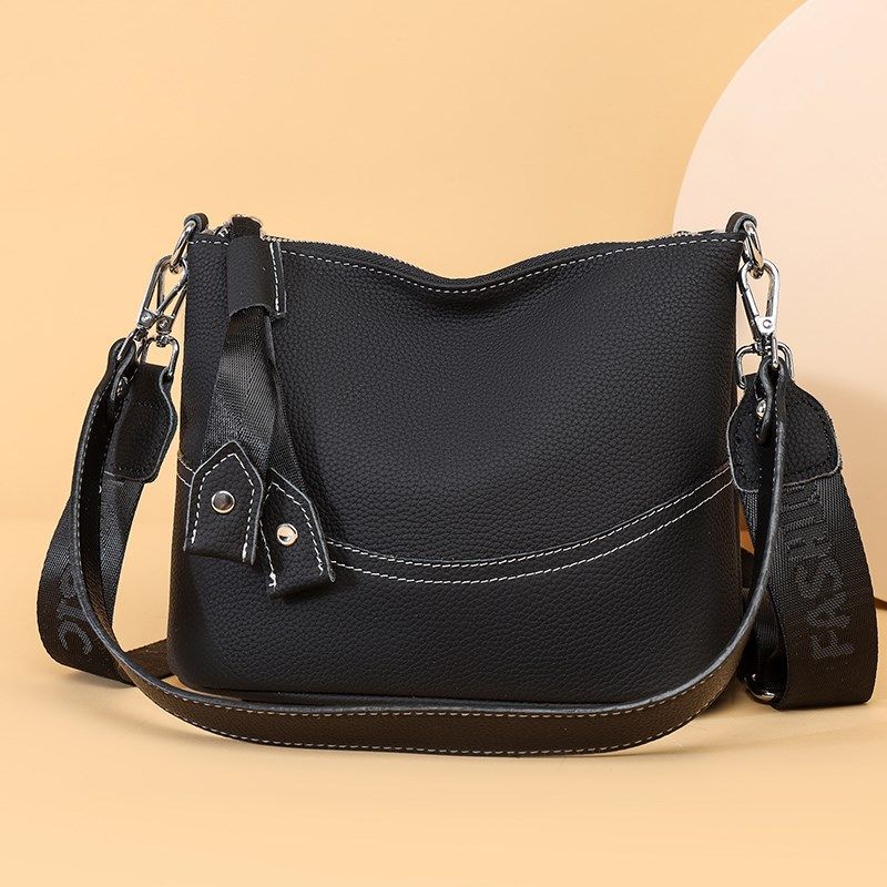 百豆新款真皮复古休闲荔枝纹水桶包实用时尚简约斜挎百搭包牛皮包