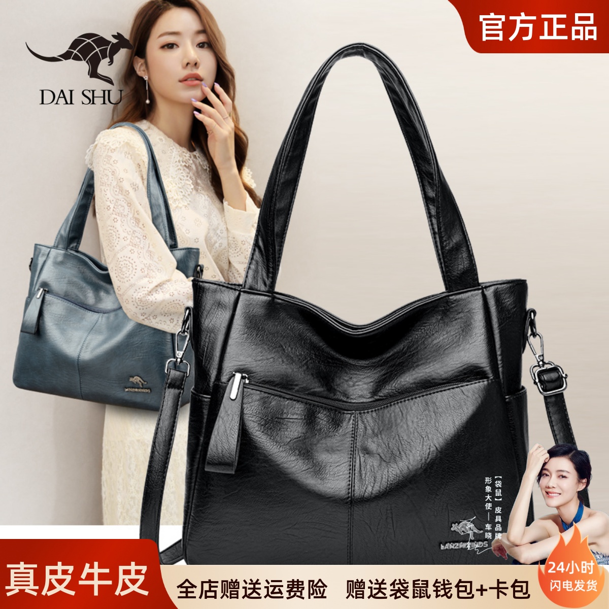 袋鼠真皮女包大容量手提包女士包包2025新款妈妈包单肩斜挎牛皮包