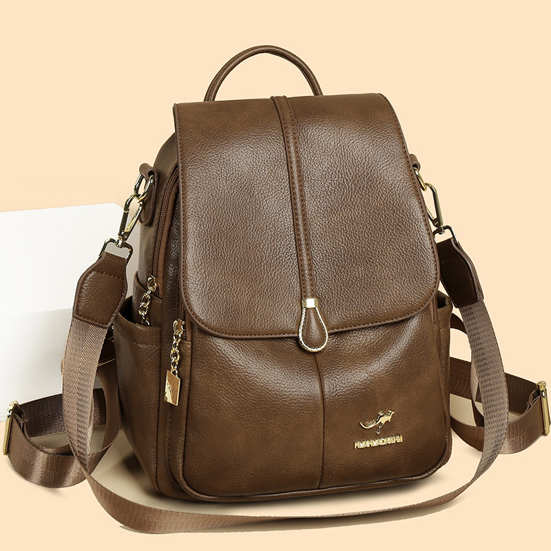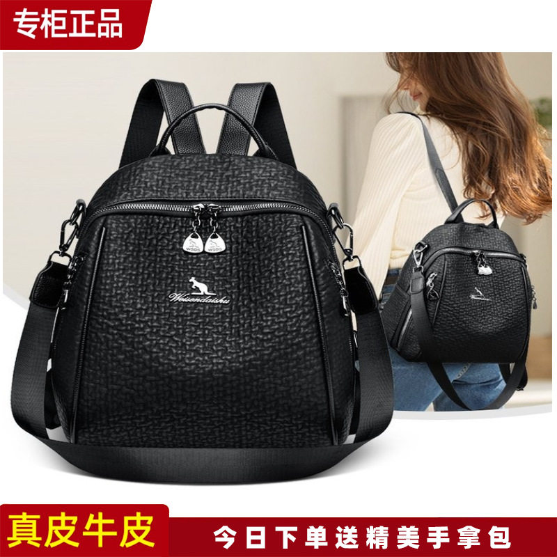 袋鼠真皮双肩包女2026新款百搭通勤背包大容量多功能休闲包牛皮包