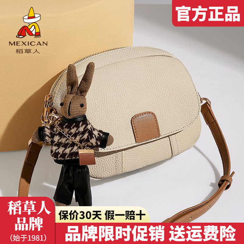 稻草人牛皮包包2025新款时尚单肩包撞色挂件椭圆包百搭斜挎包正品
