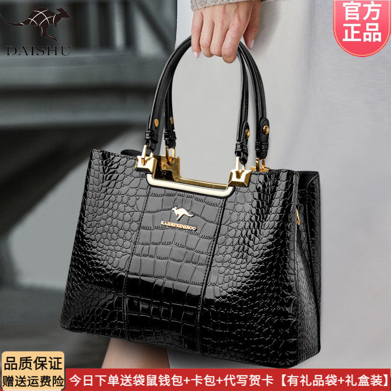 正品袋鼠皮包软皮手提包包女士包包鳄鱼皮大容量亮皮包百搭送礼包