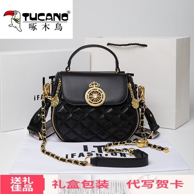 啄木鸟(TUCANO)大品牌眞皮包包女包圆包小金球链条单肩斜挎手提女包女生日礼物 送女友老婆礼盒装】黑色