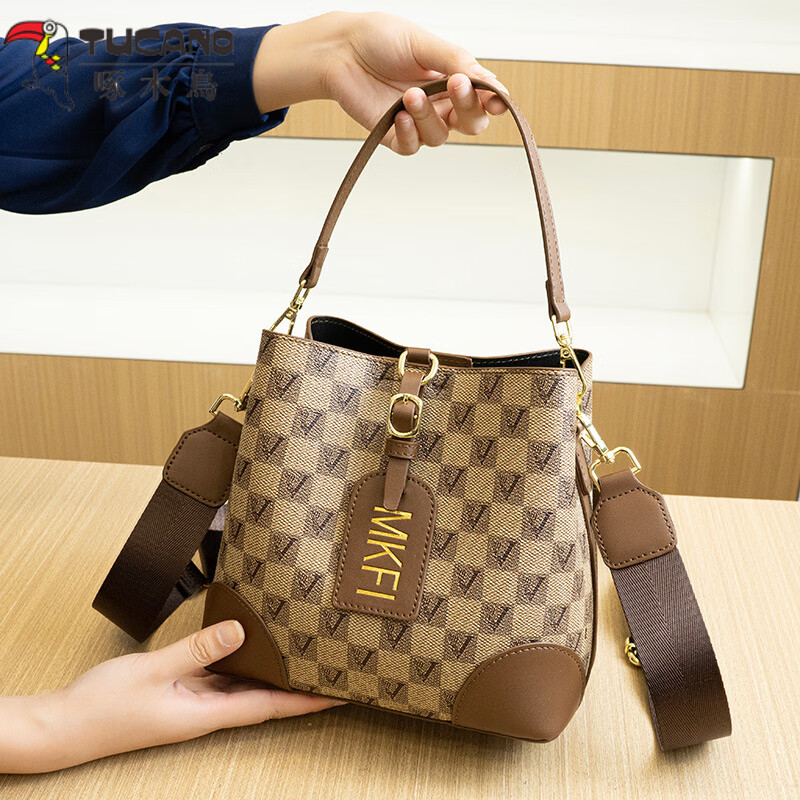 啄木鸟(TUCANO)品牌真皮包包女包高级感百搭老花水桶包时尚单肩斜挎包女生日礼物 送女友老婆礼盒装】卡其色