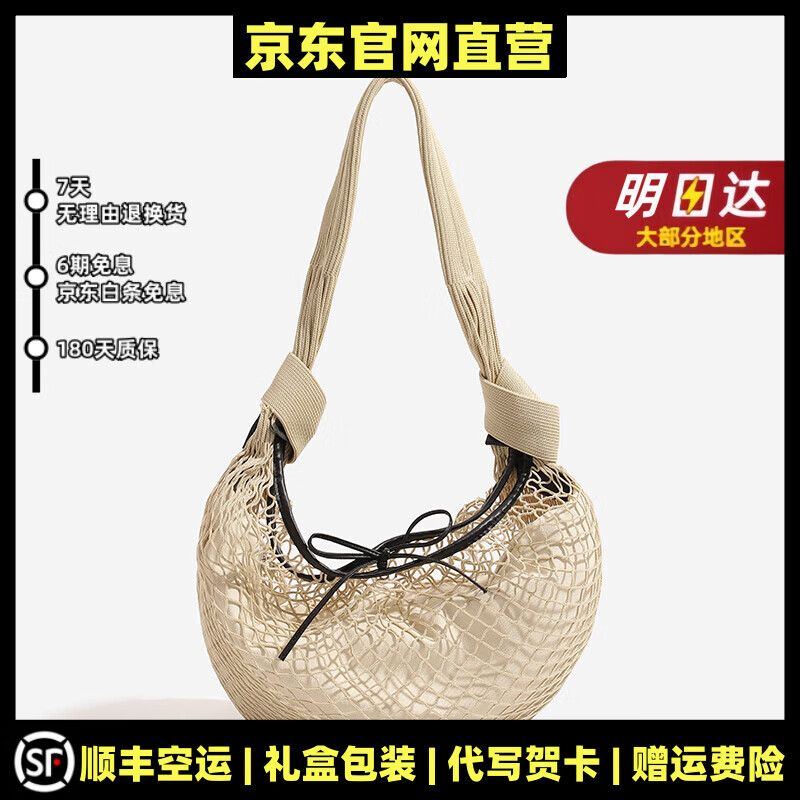 MOSPOKE轻奢品牌真皮包包女包同款撞色网兜小众编织牛角设计单肩包斜挎包 杏色【精美礼盒+礼袋】 标准【精美礼盒+礼袋】