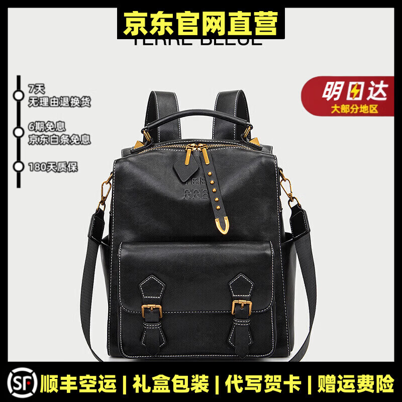 MOSPOKE轻奢品牌真皮包包女包双肩包女复古英伦风大学生书包旅行背包新潮 黑色【精美礼盒+礼袋】