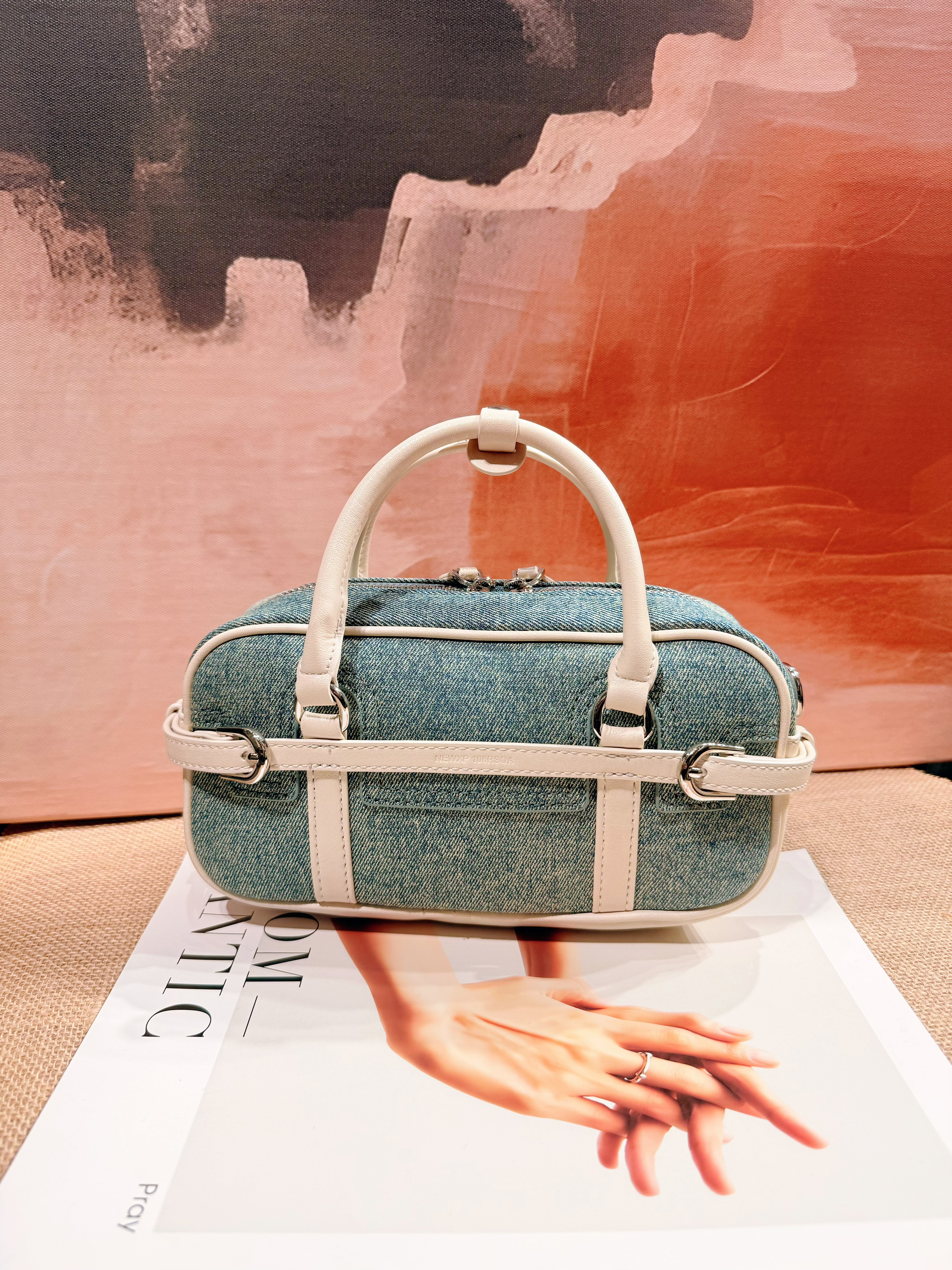 2026新款时尚手提百搭真皮牛仔拼接撞色单肩斜挎通勤女保龄球皮包