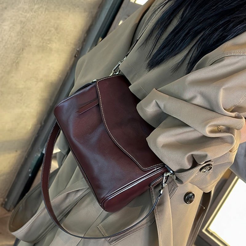 专柜品质!真皮包包新款女包斜挎包高级感覆古植鞣牛皮单肩圆筒包
