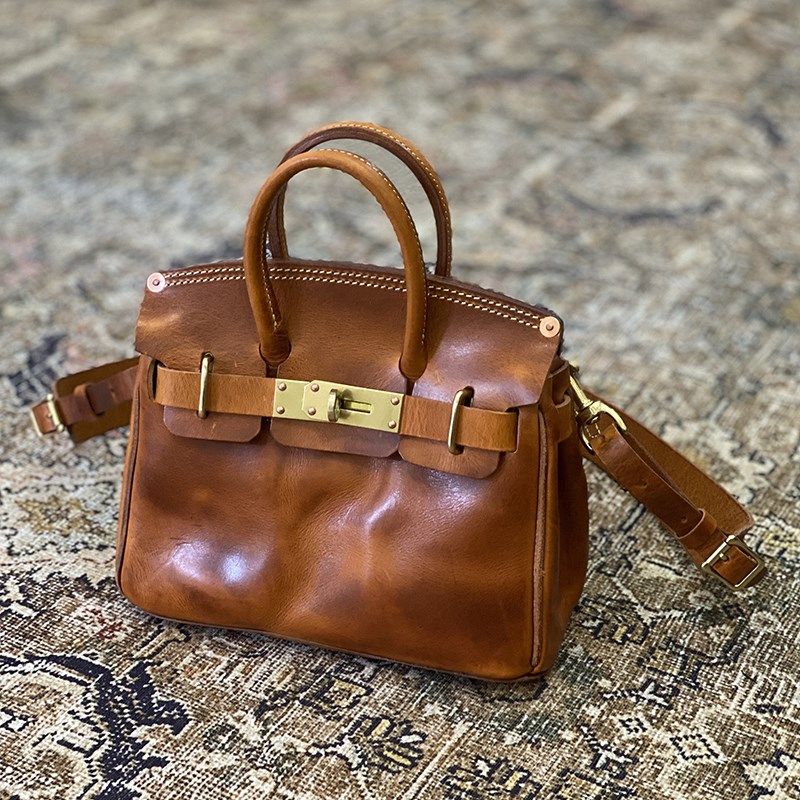 高颜值~!手工缝制复古铂金包女斜挎包植鞣牛皮包单肩包真皮女包