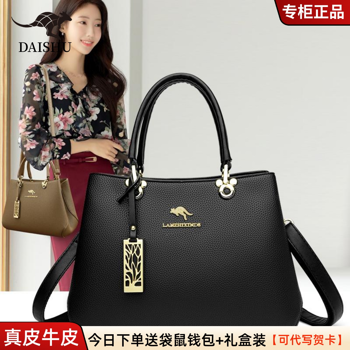 品牌袋鼠真皮包包女2025新款时尚大气手提包高级感送妈妈实用皮包
