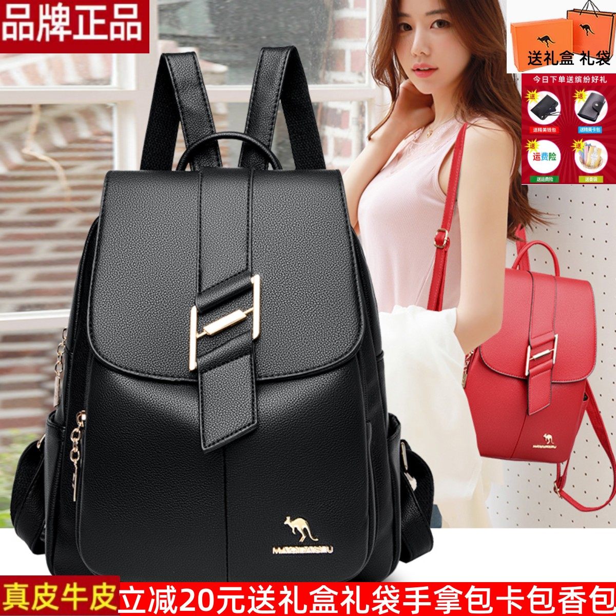 正品袋鼠女包休闲双肩包软皮新款牛皮旅游背包2026真皮包大容量潮