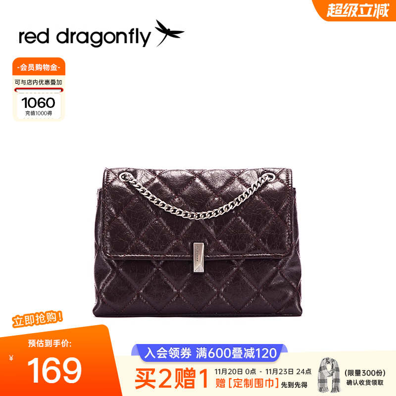 红蜻蜓复古斜挎包链条包棕色油蜡皮包包女式小香风菱格单肩小方包