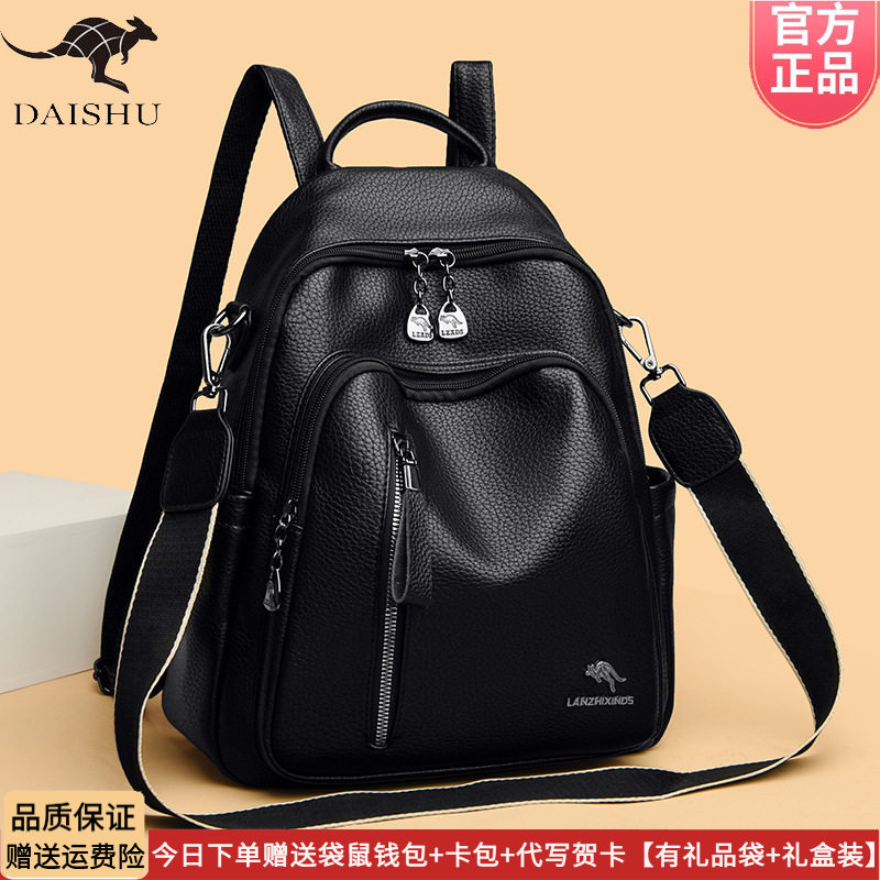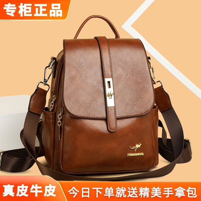 正品袋鼠双肩包女皮包2026新款软皮女士背包时尚妈妈包大容量旅行