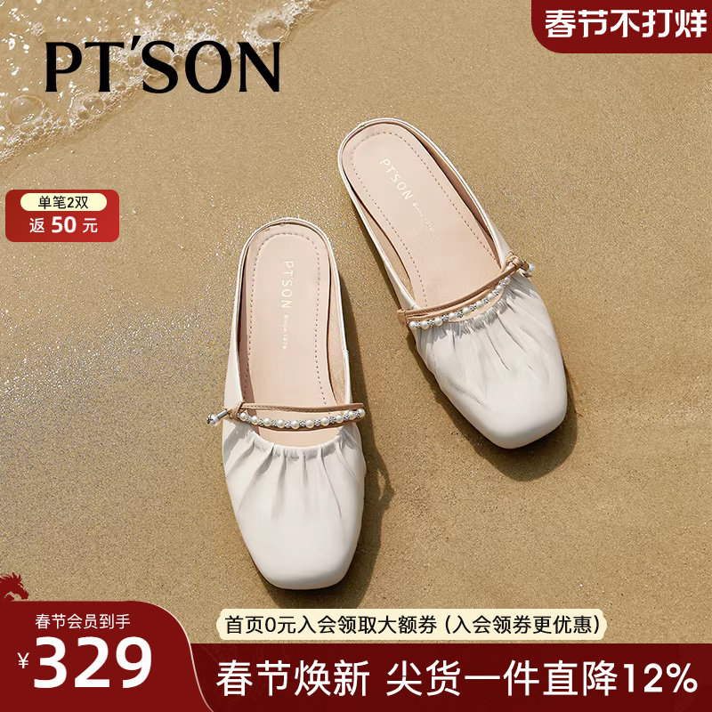百田森舒软羊皮穆勒鞋女春夏新款真皮包头拖鞋褶皱水钻平底半拖鞋