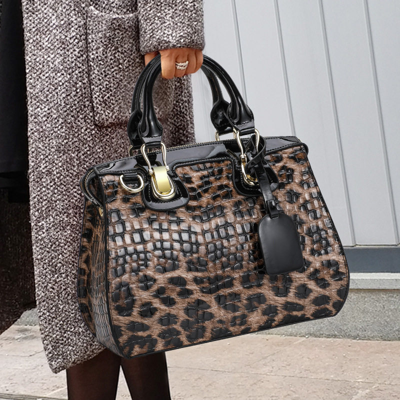 千典豹纹女包定型皮包手提包女式纯牛皮包手提单肩斜挎三用硬女包