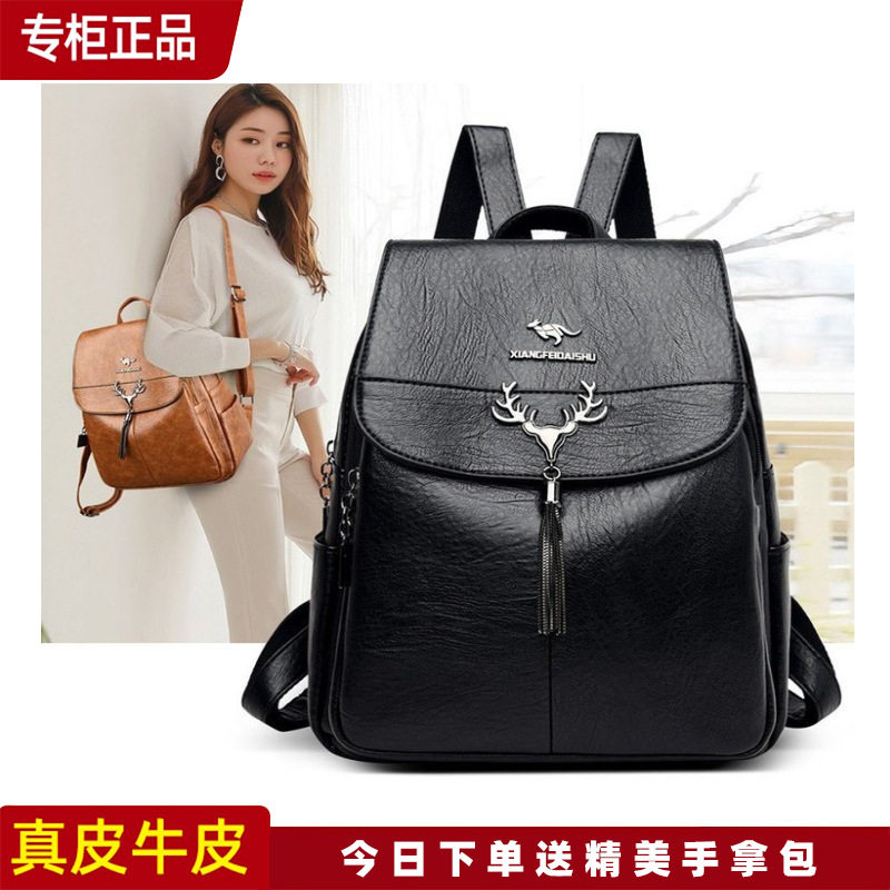 正品袋鼠皮包双肩包女2026新款时尚百搭大容量软皮包软皮女士背包