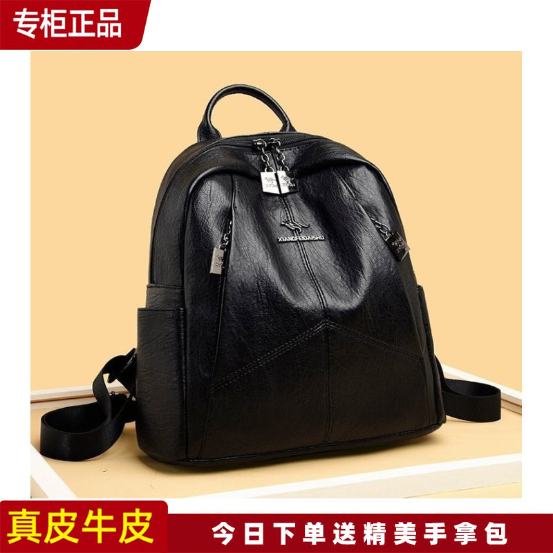 正品袋鼠真皮双肩包女包包2024新款旅行背包大容量时尚百搭软皮包