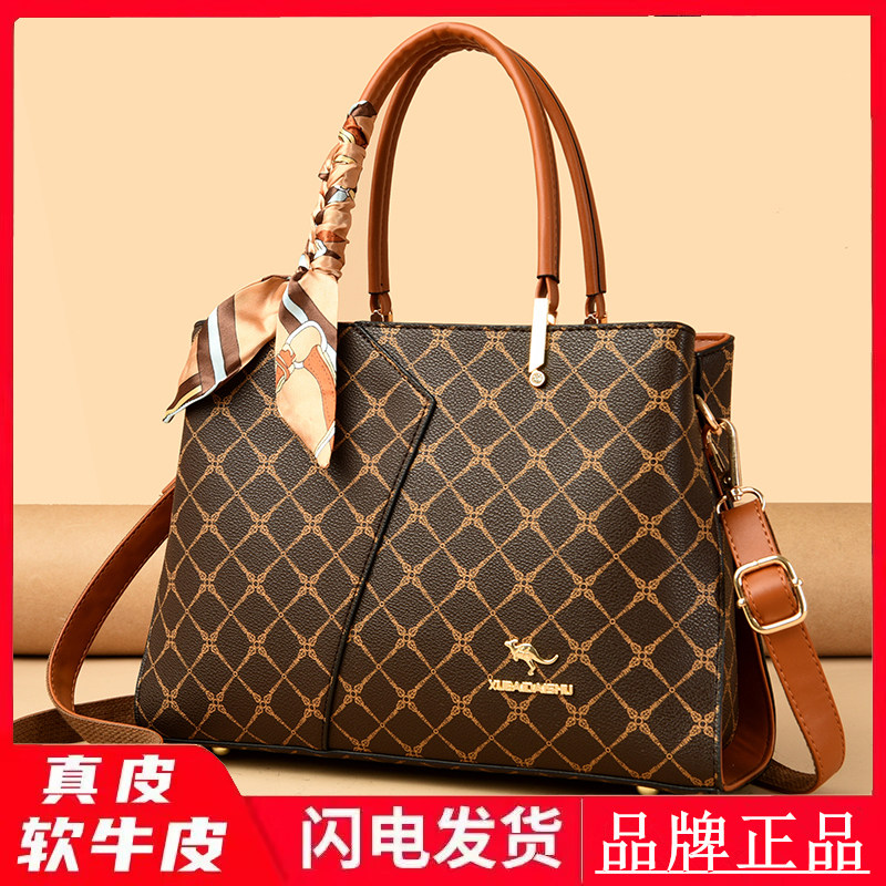 正品袋鼠女士真皮手提包2026新款时尚牛皮包百搭中年妈妈斜挎皮包