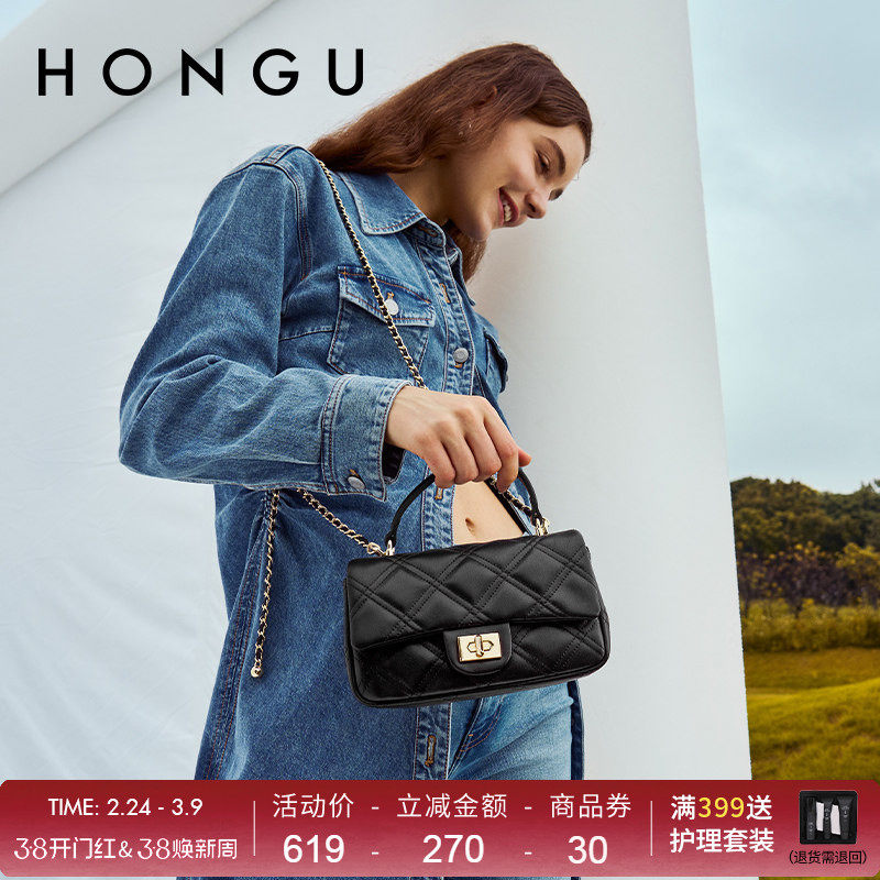 HONGU/红谷女包包小众高级感气质手拎单肩包菱格链条斜挎包牛皮包