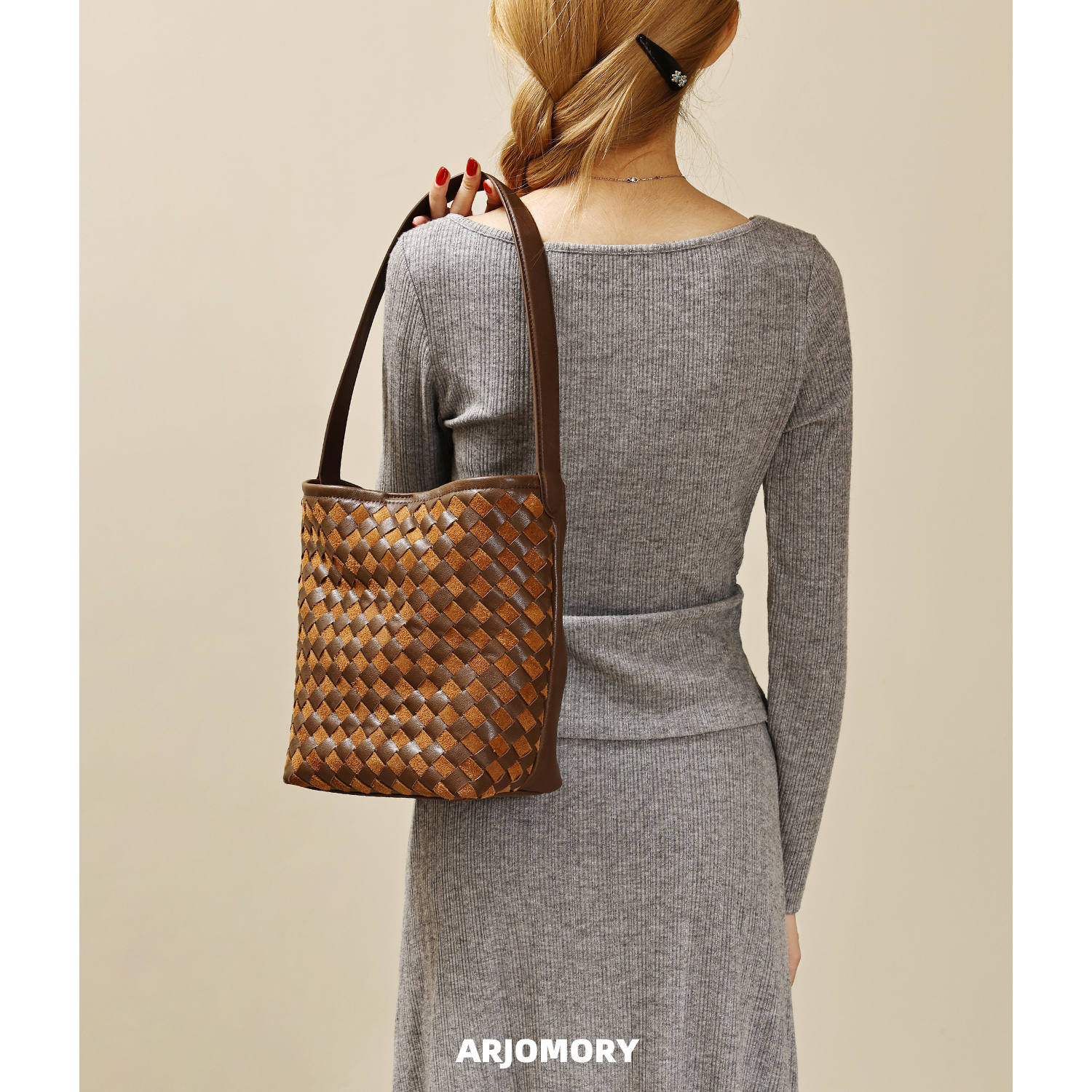 ARJOMORY小众设计头层牛皮编织托特包女2025秋冬通勤大容量水桶包