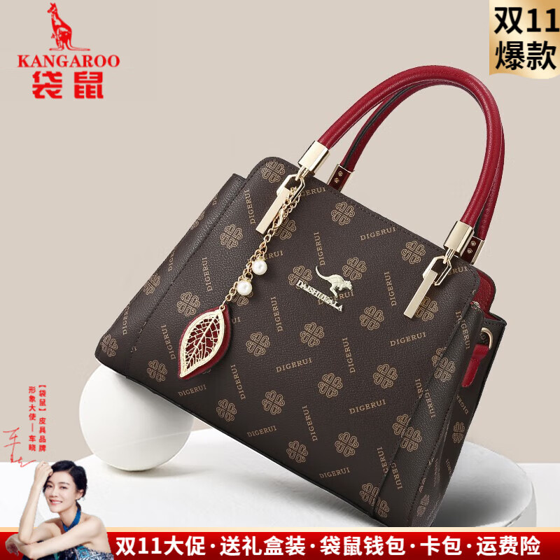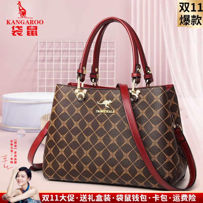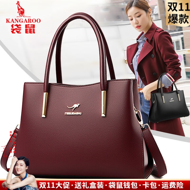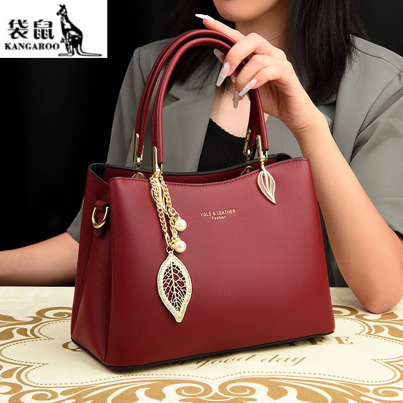 袋鼠轻奢品牌真皮包包女女士包包新款婚礼妈妈包手提百搭牛皮斜挎女包 尊享酒红(80买家选择)