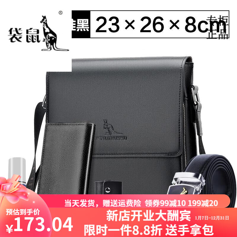 袋鼠轻奢品牌单肩包男商务斜挎包包公文包男背包牛皮包真皮男士小包潮 黑色升级标准号买一六