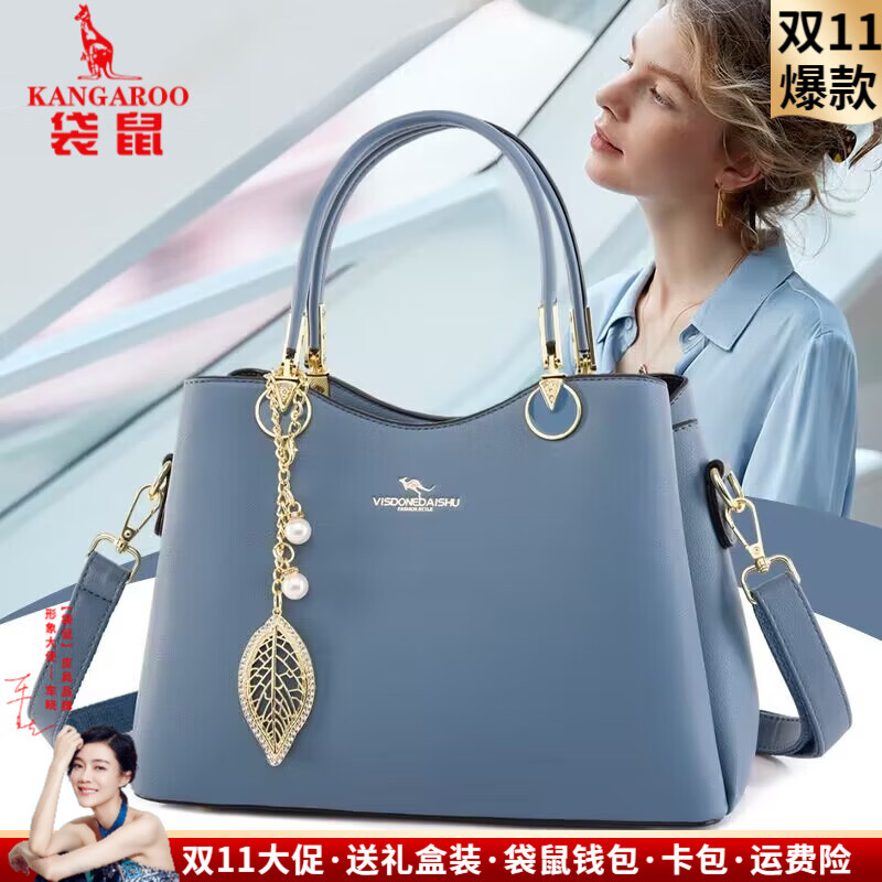 袋鼠品牌真皮包包2025新款女包气质斜挎包送妈妈手提包高档女式单肩包 水蓝色(配礼盒+手包卡包)