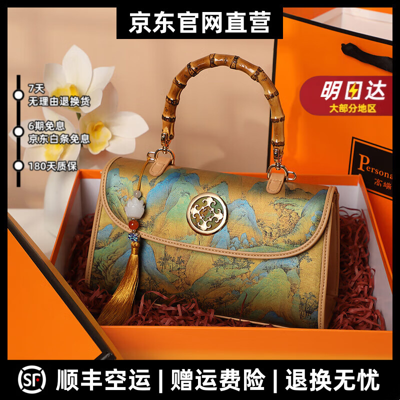 MOSPOKE轻奢品牌真皮包包女包妈妈大气手提包大容量单肩包斜挎包 千里江山图+礼盒套装