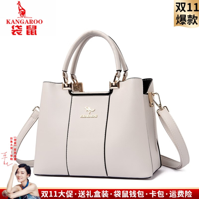 袋鼠生日礼物送妈妈包包女包品牌真皮包2025新款中年女士手提包斜挎包 米白色(礼盒+手包卡包)