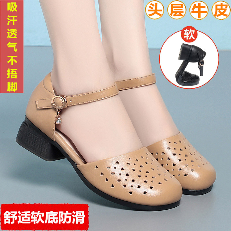 时尚真皮包头凉鞋女夏季新款镂空平底低跟软底中年妈妈鞋大码皮鞋