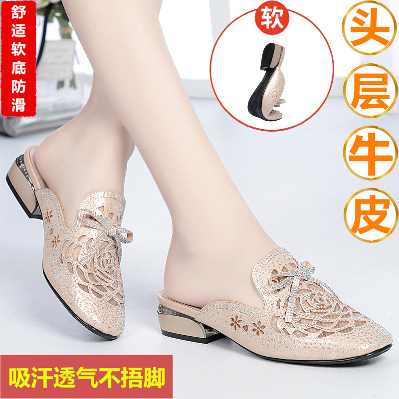 真皮包头半拖鞋女夏季外穿网纱镂空水钻半托女鞋气质平底妈妈凉拖