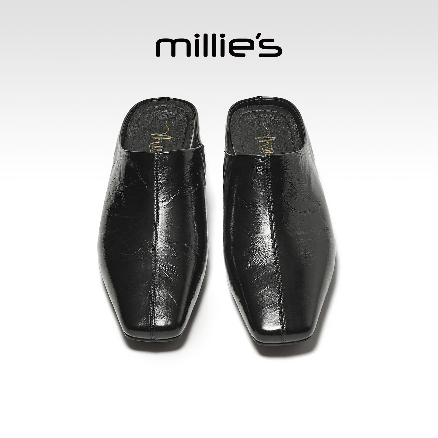 MILLIE'S/妙丽黑色真皮包头半拖鞋女简约方头软底穆勒鞋春夏新款
