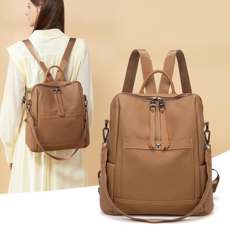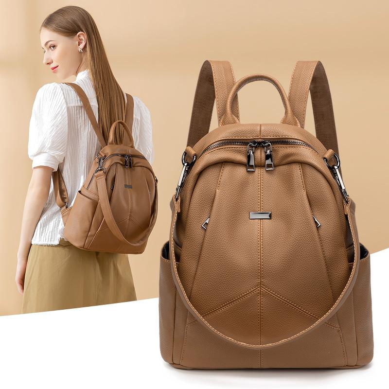 双肩包女通勤棕色新款百搭高级软皮包包女简约大容量轻便旅行背包