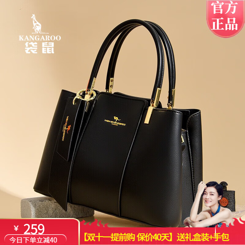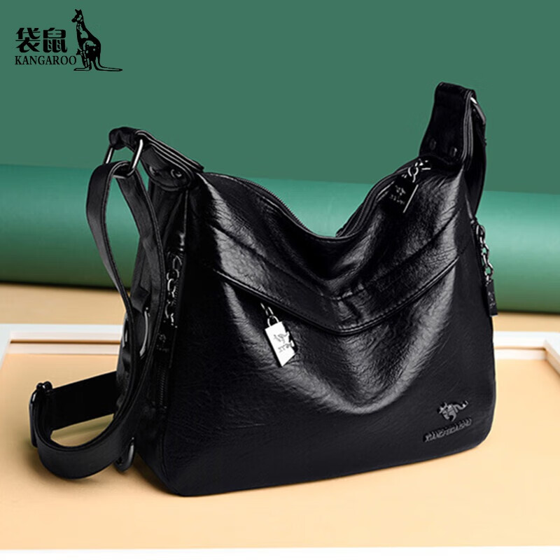 袋鼠(KANGAROO)女包2023新款女士单肩斜挎包中年妈妈手提软皮包包潮 黑色