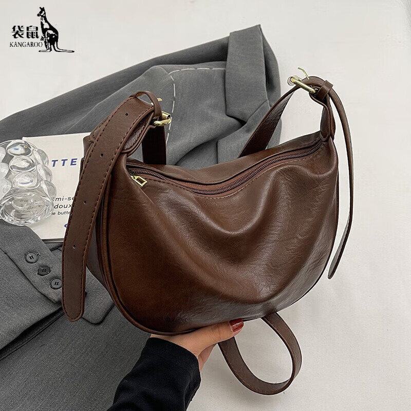 袋鼠大容量饺子包包女士2025软皮包女斜挎包质感月牙包单肩腋下包 咖色无挂件